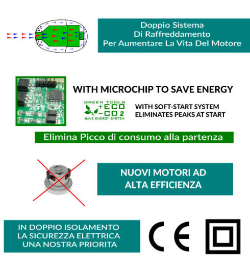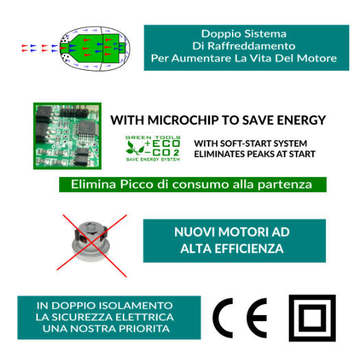 Grande in Ogni DettaglioCon microprocessore e software per un maggior controllo della potenza. Ecologico: con sistema elettronico Save Energy System, sistema soft start-system che evita i picchi di consumo all'avviamento.Un appercchio professionale con le sicurezze di un elettrodomestico. In Classe 2 di isolamento elettrico, Non richiede la presa a terra. Senza Pulsanti elettrificati.Sistema di raffreddamento con Doppio Guscio per un raffreddamento ottimale. Motori ad alto rendimento e più pressione.Con le migliori materie plastiche: Gli apparecchi metallici possono veicolare scosse elettriche.