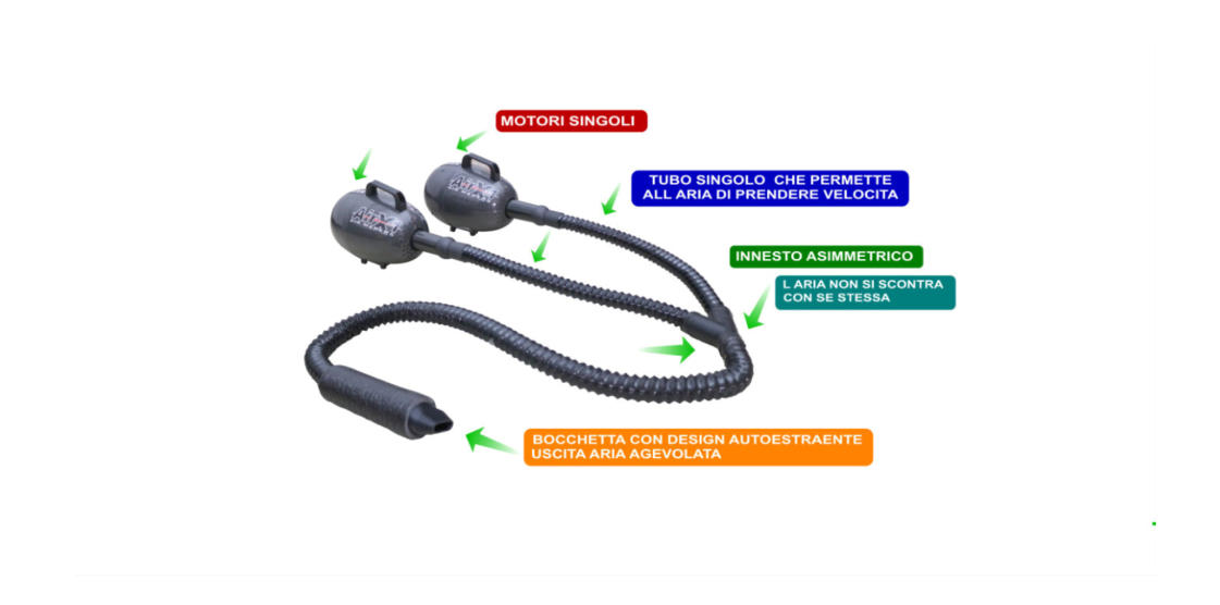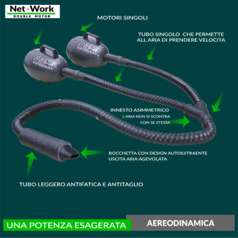 AereodinamicaNet-Work-Dryer® con 2 motori singoli che si controllano con un unico comando.Aereodinamica e Flussi d aria migliori per renderlo il piu veloce nell asciugatura e farti perdere meno tempo possibile.1- Tubi singoli che permettono all aria di prendere velocità.2- Innesto sul tubo unico Asimmetrico in modo che l aria stessa non crei turbolenze ed esca più velocemente possibile.3- Bocchetta con design Autoestrente con un portata d’aria equilibrata che tende a non arrotolare il peloMotori ad alta efficienza genera una pressione superiore abbassando cosi i tempi di asciugatura a pari consumo elettrico = minor costi dienergia.