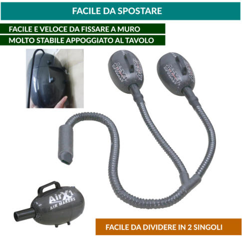 Praticoil Sistema Soft-Start di partenza dolce rende il Net-Work-Dryer® il soffiatore cani più stabile del mercato. Non da colpi alla partenza non tende a ruotare. Cosi lo puoi Muovere Facilmente sui tavoli e fissarlo sul muro appoggiandolo solo a un gancetto e spostarlo Facilmente su altre pareti .Tubo Antifatica è il piu leggero del mercato è molto flessibile, antitaglio e resiste al calore meglio di tutti.Inoltre se serve può essere facilmente diviso e utilizzato come 2 soffiatori singoli.