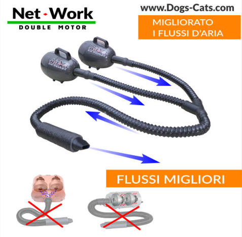 Soffiatore per cani doppio motore con potenza esagerataNet-Work-Dryer® Soffiatore per cani con doppio motore con una potenza d’aria Esagerata ma meno consumi d energia.Ideale per cani grandi. Velocizza il tuo LavoroRisparmia Tempo e FaticaCon moderno motore ad alta pressioneTubo leggero, flessibile che non affatica le braccia.